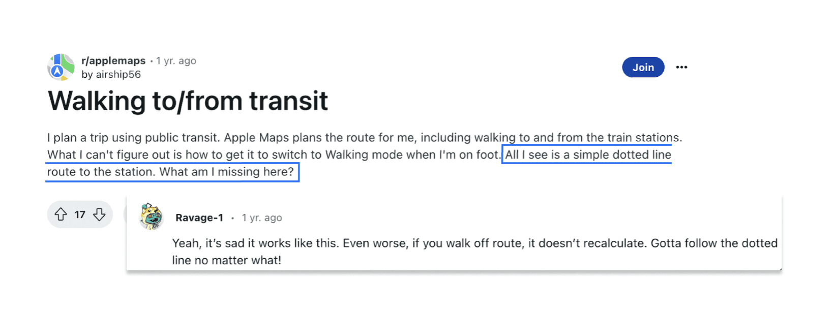 Discover the pain points users currently feel when using Apple Maps for public transportation