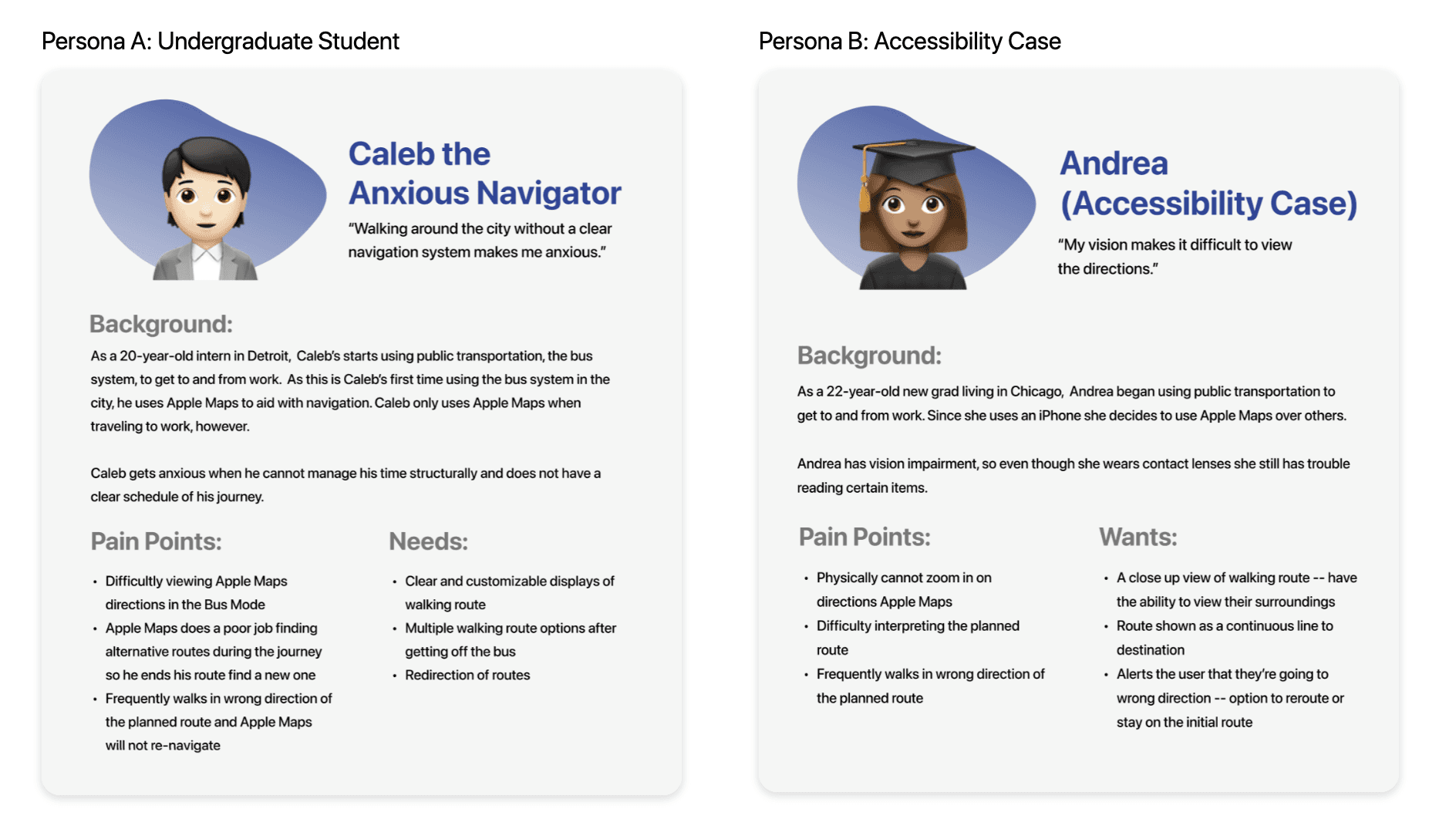 I ensured my personas accounted for different experiences and potential health impairments to analyze how those affect their time using Apple Maps.