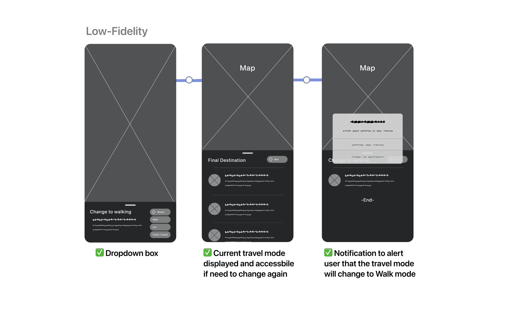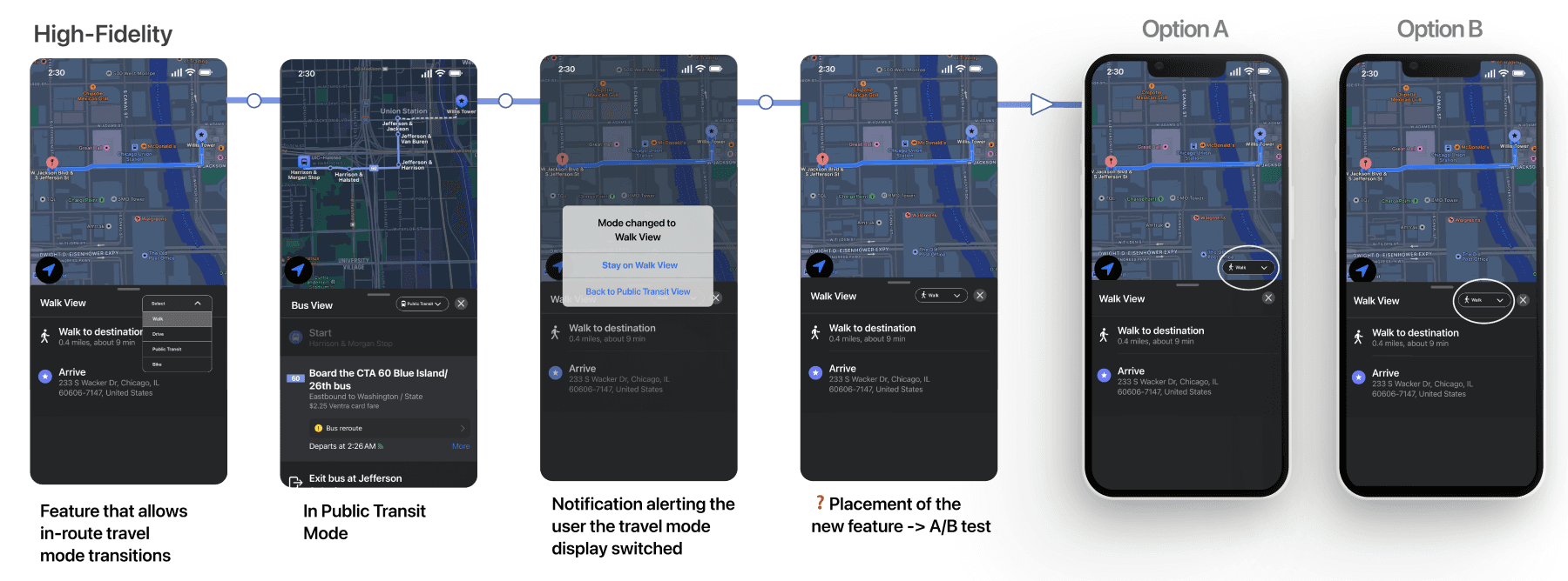 Turning my low-fidelity designs to high-fidelity, I ran into areas where I was unsure about the placement of features. I wanted to ensure that the dropdown box wouldn't hinder the user's view of the directions, so I conducted A/B testing. 76% voted that they preferred option B because the dropdown feature didn't obstruct the map view. With Steering's Law in mind, I aimed to minimize as much movement when switching travel modes for an efficient experience.
