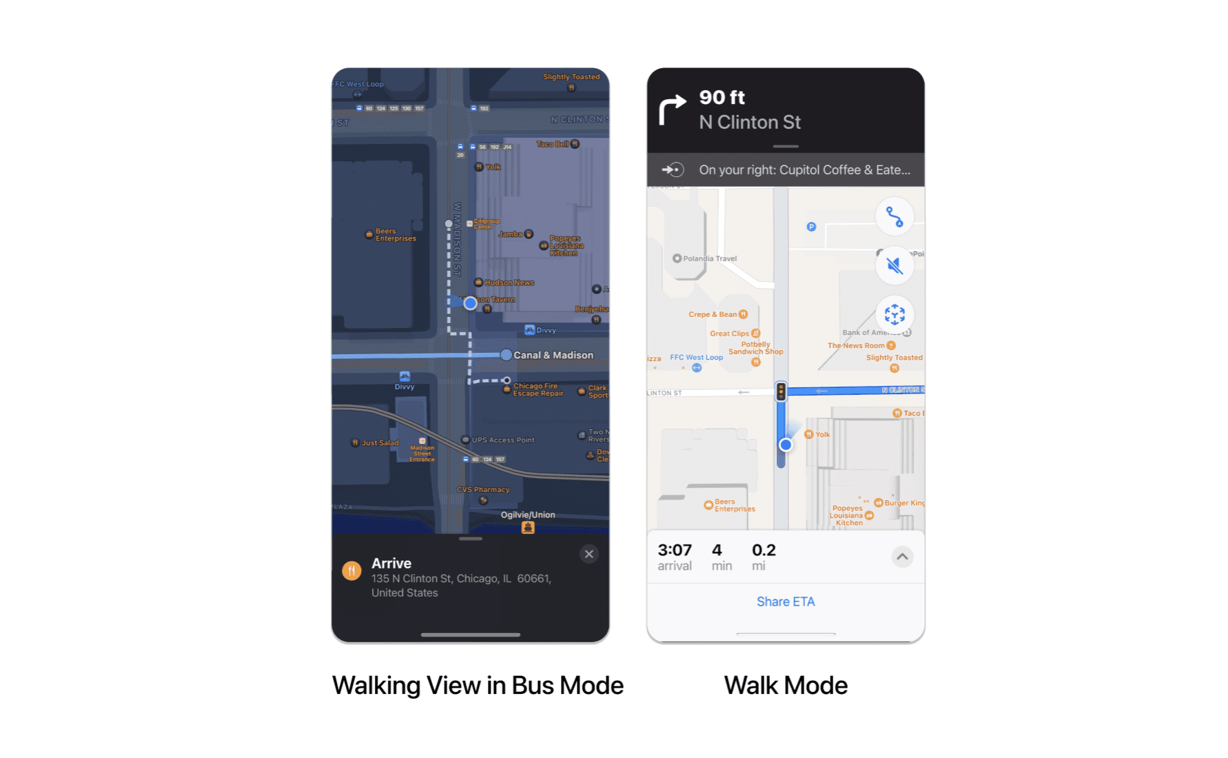 Living in Chicago over the summer, I used their public transportation system to get around. I used Apple Maps everyday to navigate the bus and walking routes. As a woman commuting alone in a large city, I preferred Apple Maps due to its accurate live bus schedule times. Using the app everyday, however, I became frustrated not being able to change the displays of the walking route, which would be possible when in Walk mode.