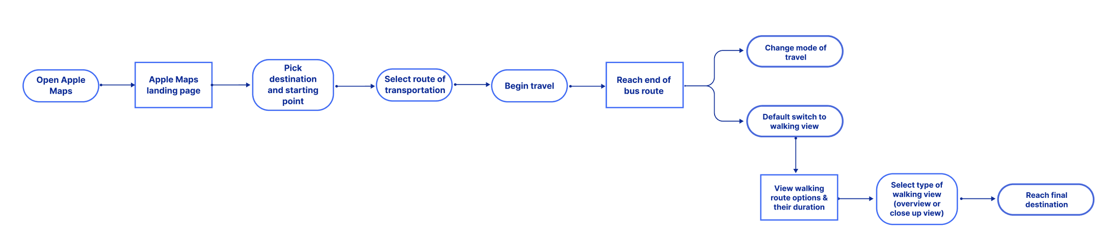 I developed a user flow that lays out how users would interact with Apple Maps if my ideations were implemented. After refining my design decisions based on the users' pain points and preferences, I created a potential user flow to identify potential bottlenecks in my ideas and, ultimately, finalize the design structure.