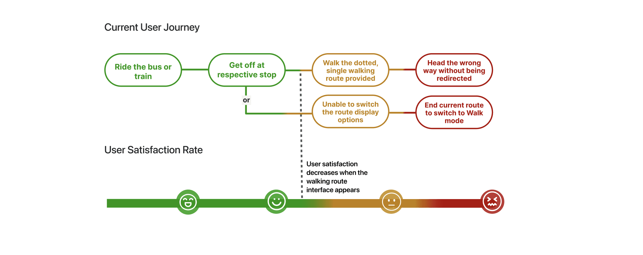 Currently, when users end their bus or train route and are prompted to start walking to their final destination, user satisfaction begins to drop off due to the lack of cohesiveness.