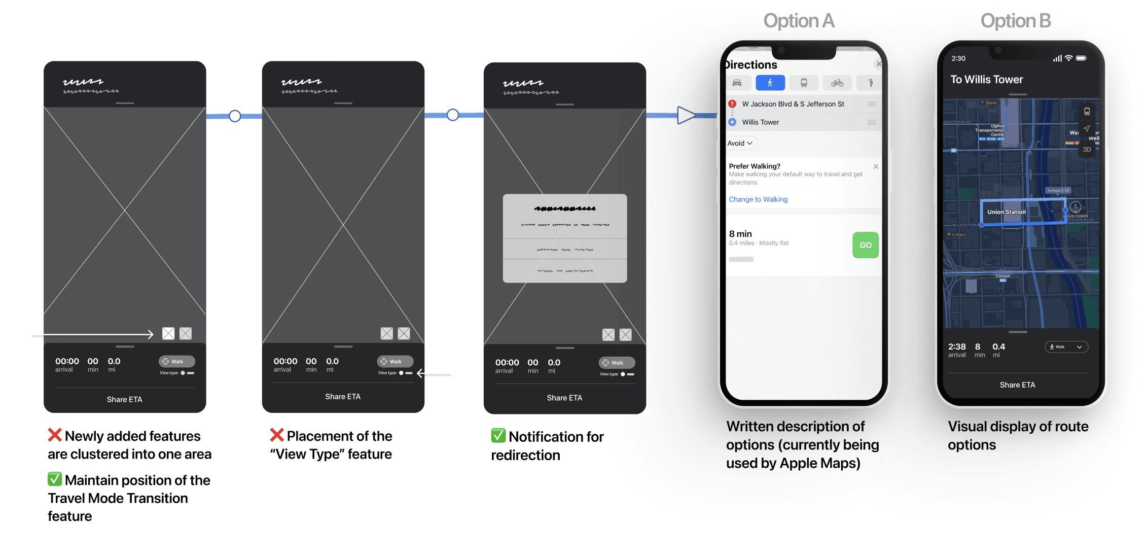 I conducted A/B testing to see if users preferred Apple's current design which is a written view of route options (Option A) or my proposed design solution being more of a visual display (Option B). 82% participants preferred option B.