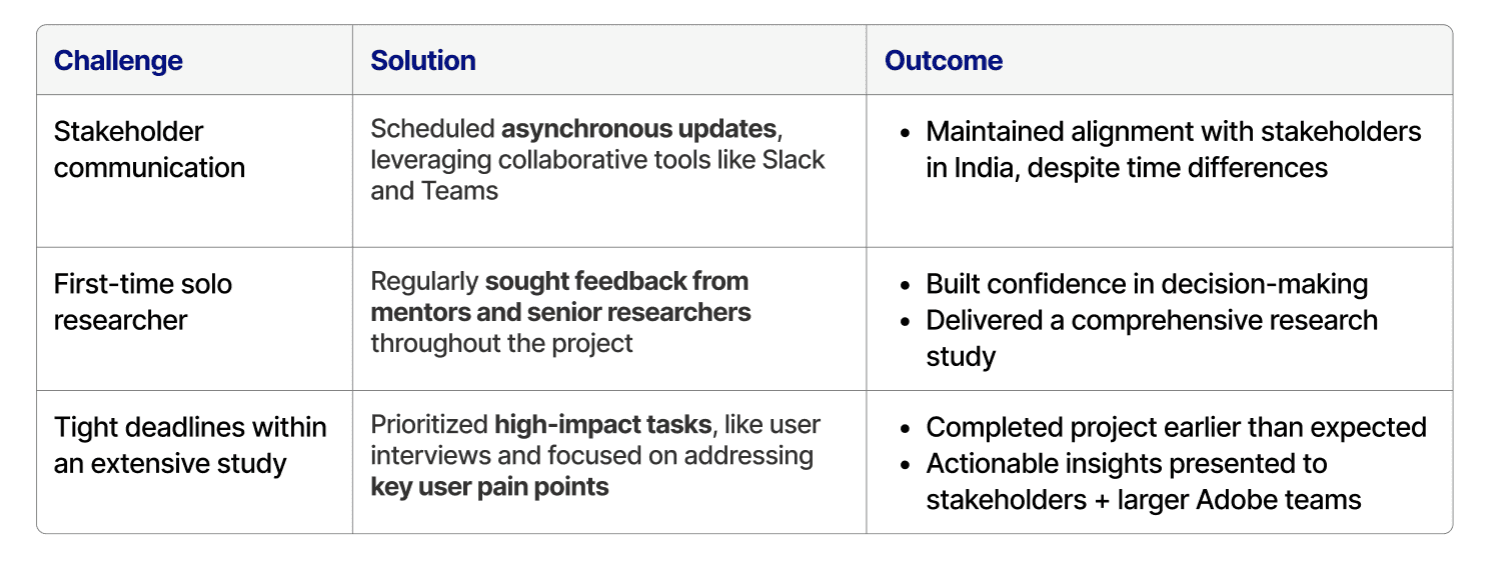 Facing challenges as a first-time solo researcher, I identified and implemented solutions to drive impactful outcomes.