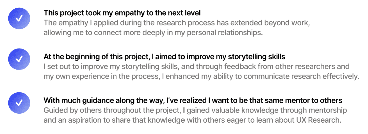 Providing regular research updates, involving stakeholders in user interviews, and leading a midpoint review, I grew confident when presenting questions and communicating insights clearly to stakeholders.