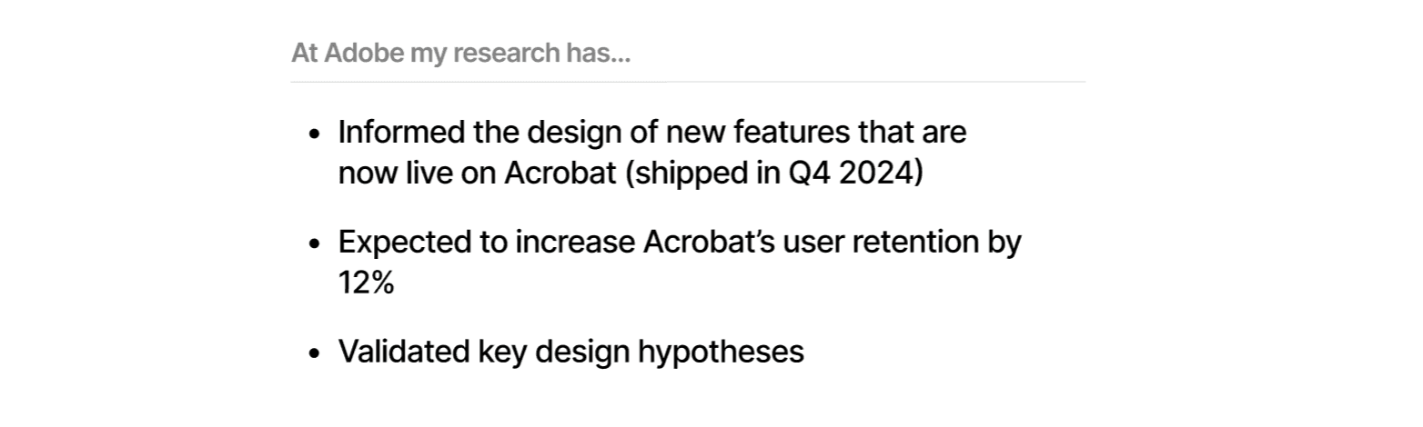 Led mixed-method research (12 interviews, 100+ surveys) uncovering enterprise SaaS workflow pain points, driving insight-based design recommendations that boosted B2B value realization by 12% and culminated in shipping a new cross-platform e-signature experience (Q4 2024).