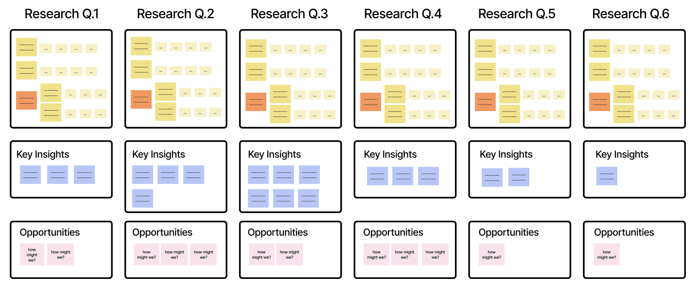 Organizing my data points into 6 themes (research questions) and connected overlapping insights, I synthesized my research into 20+ key insights.